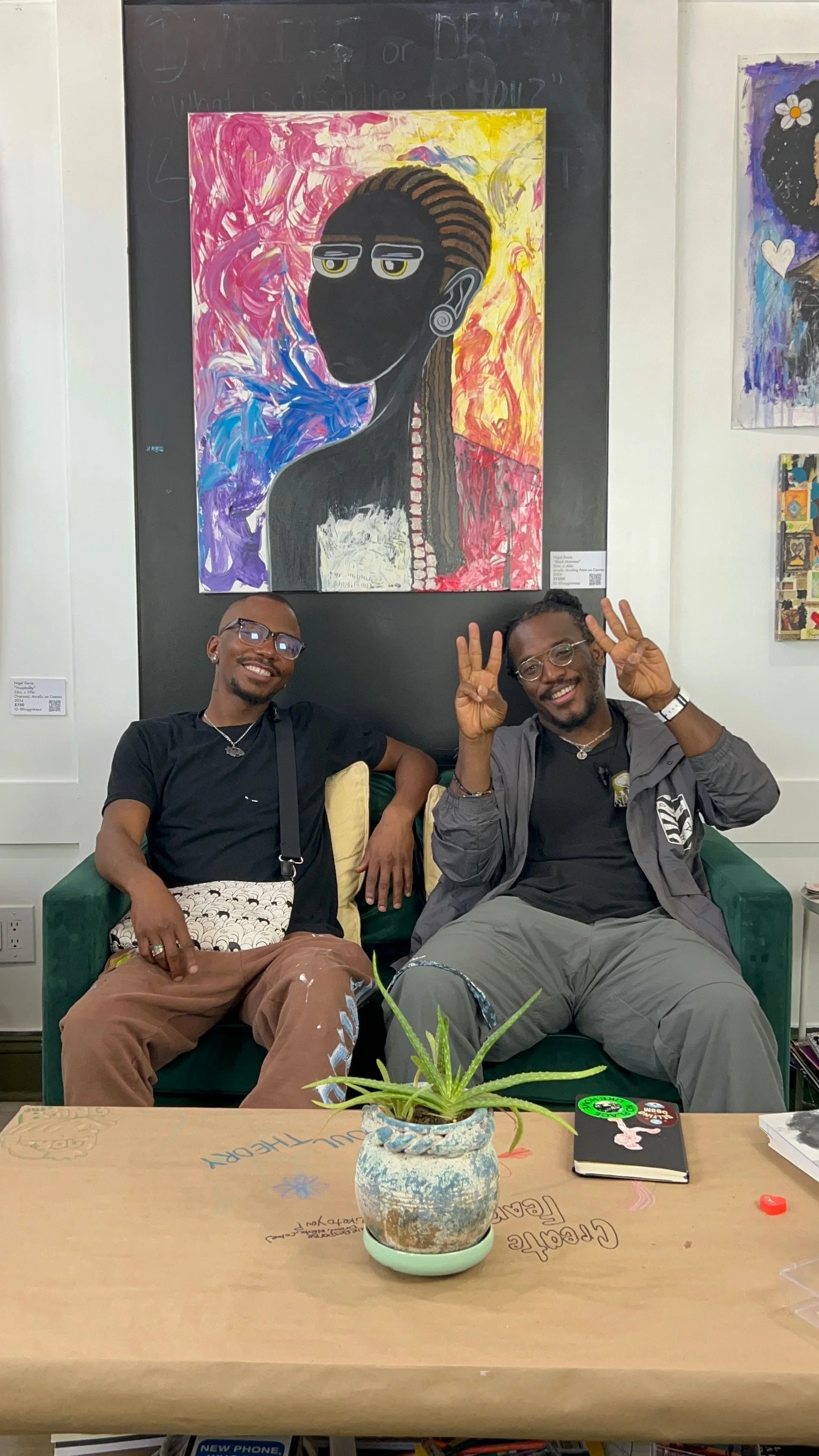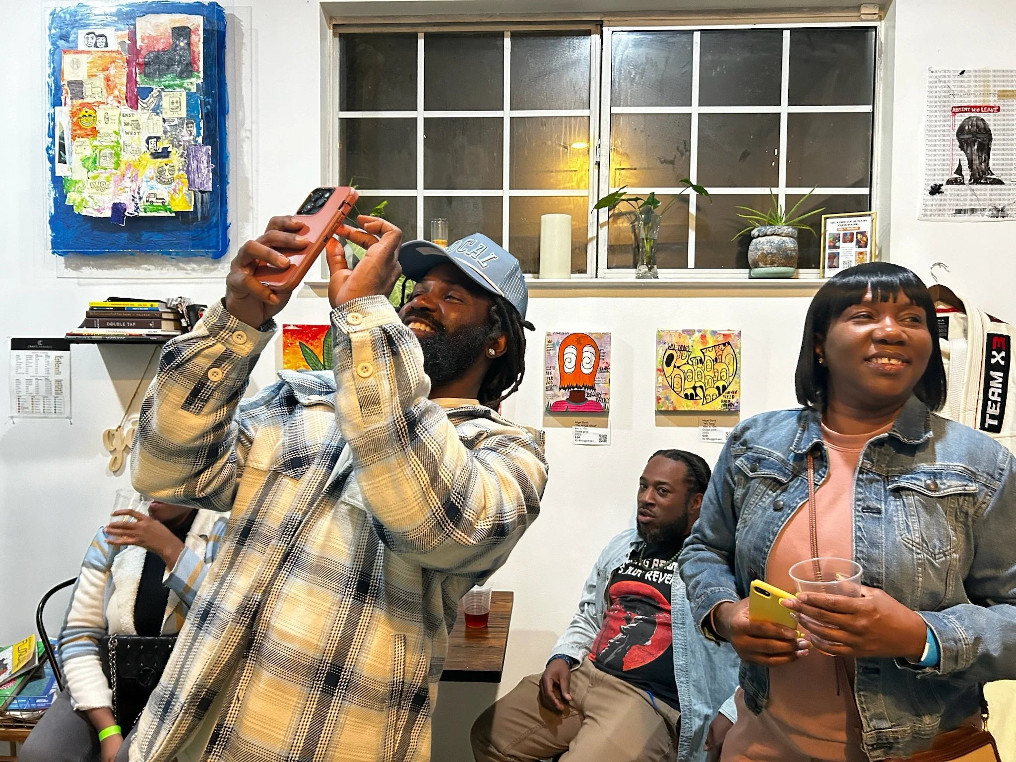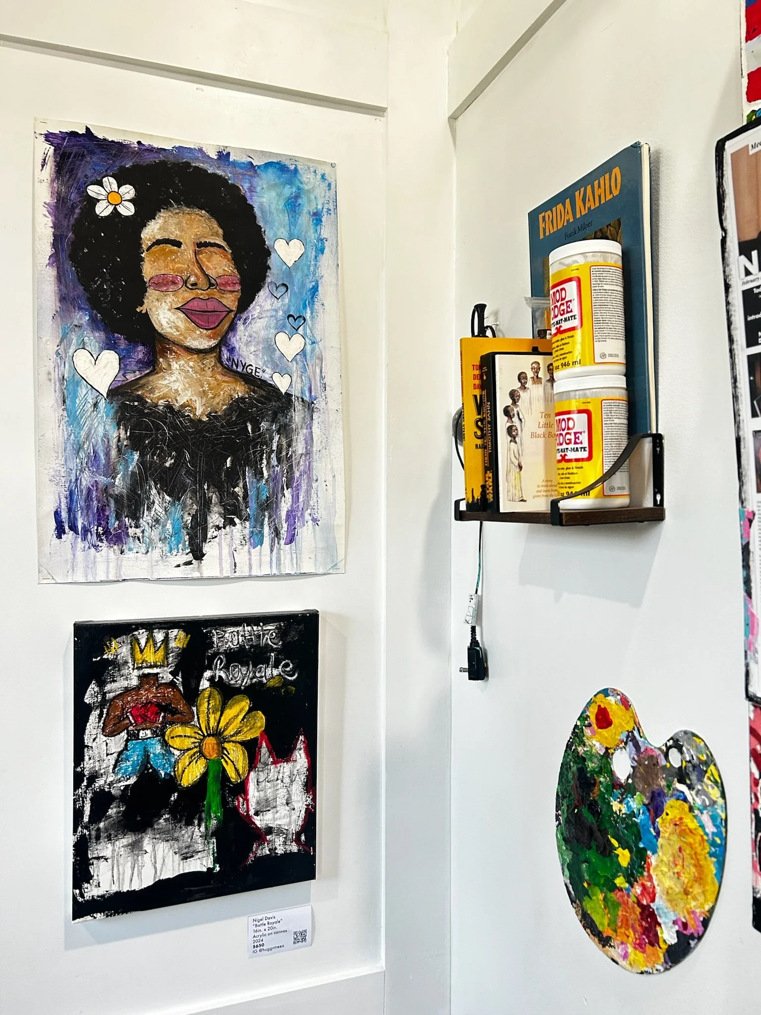 (December 2024–April 2025), curated by K. Medulla, was Bookstore Gallery’s first artist residency, transforming the conference room into an immersive, interactive space. Working with Nigel Davis, she handpicked artwork, helped produce a paper chandelier, and brought in studio materials to create a lived-in, artist-inspired environment. She designed print and digital content for Art Dojo. The residency explored self-reflection, love, heartbreak, feminism, pro-Black identity, and spirituality, with private tours giving patrons deeper insight. The project launched Couch Potato, a podcast connecting artists, entrepreneurs, and advocates. The opening featured art prints and hemp teas; the closing included partnerships with Soul Theory and Ape Water to music vibes by DJ Kiya Lacey, signature cocktails, a QR code scavenger hunt by Eanaj Janae, and a panel discussion.